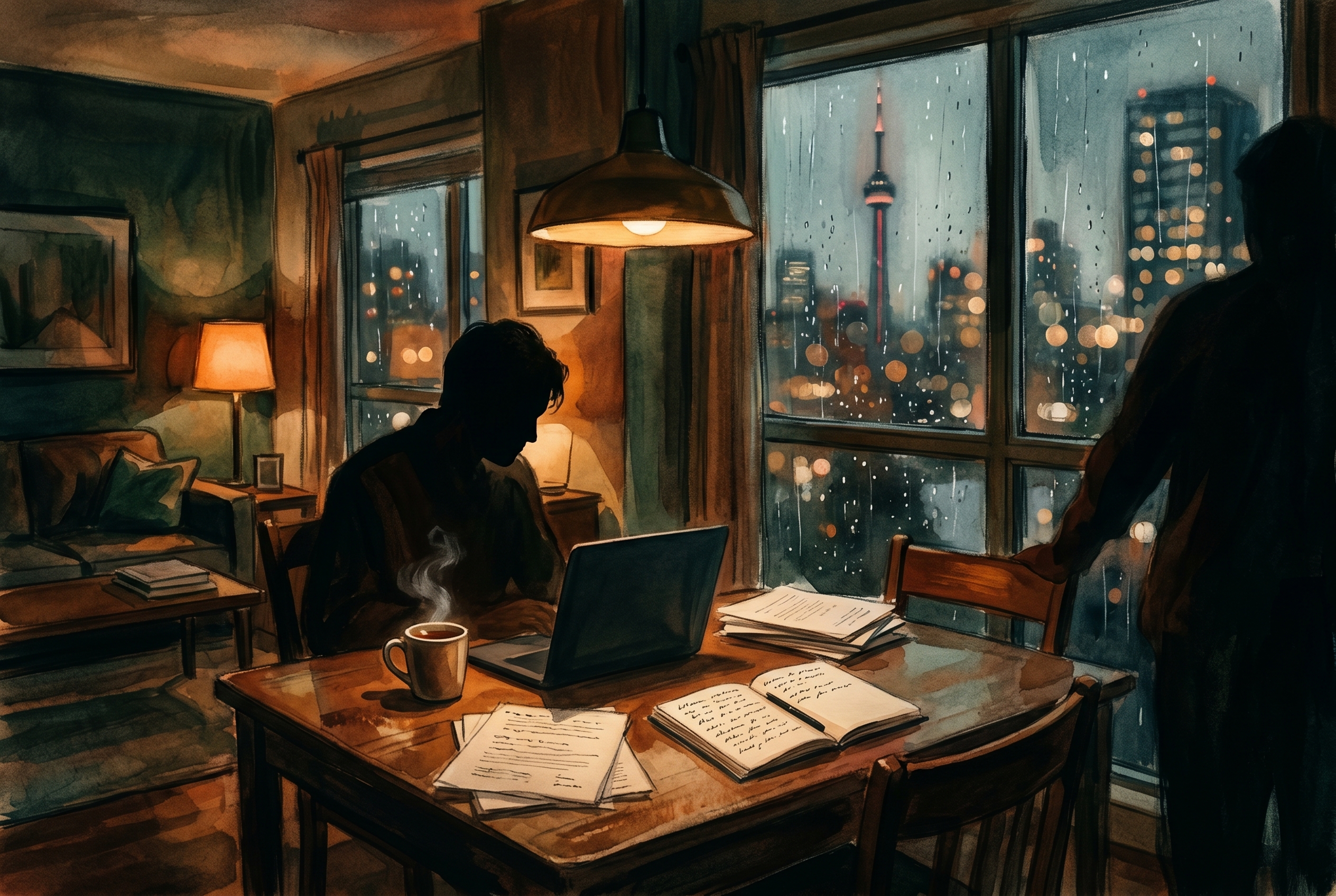 Rain tapped lightly at the window. The room had gone very still in the way Toronto sometimes did after midnight, as if the city had decided to lower its voice without quite going silent.