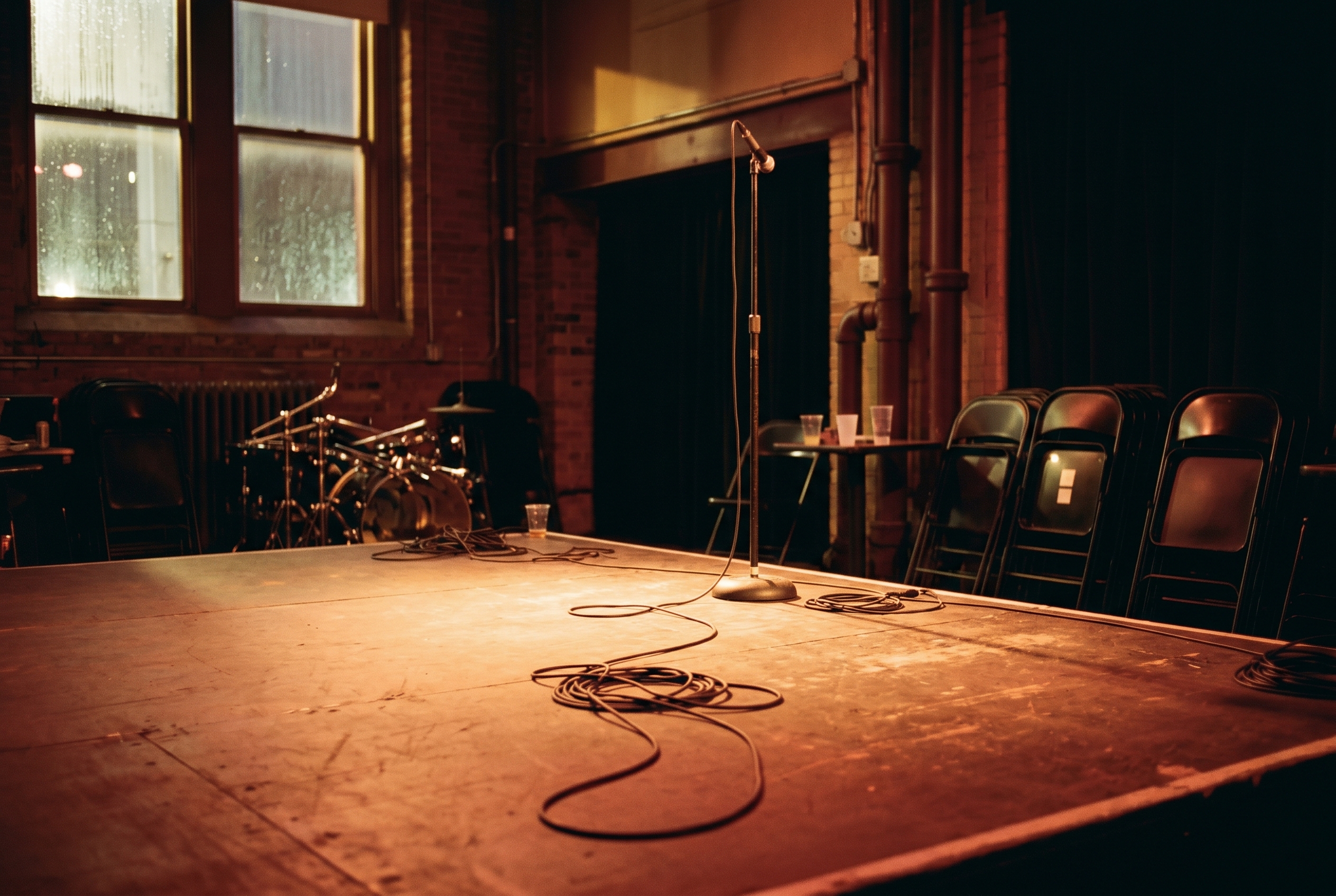 They stood near the drum kit, the room wide and dim below them. Rain tapped the high windows over the lobby. Somewhere in the building, pipes clicked awake.